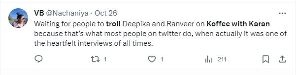 Thinking of this moment in the latest ep of Koffee With Karan when you can see that Karan is happy for Deepika and Ranveer but is clearly envious of the love they share which is missing in his life. Culturally, we don't discuss envy very often and I found this really touching. pic.twitter.com/jpo2m96DK0