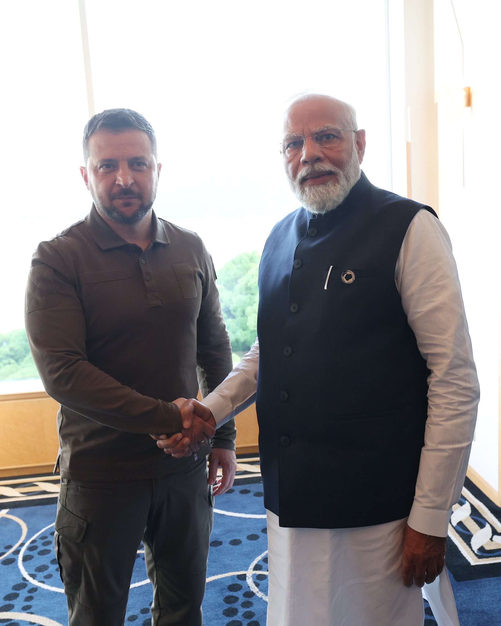 PM Narendra Modi and Ukraine President Volodymyr Zelenskyy shaking hands at G7 Summit. Photo: Twitter/narendramodi