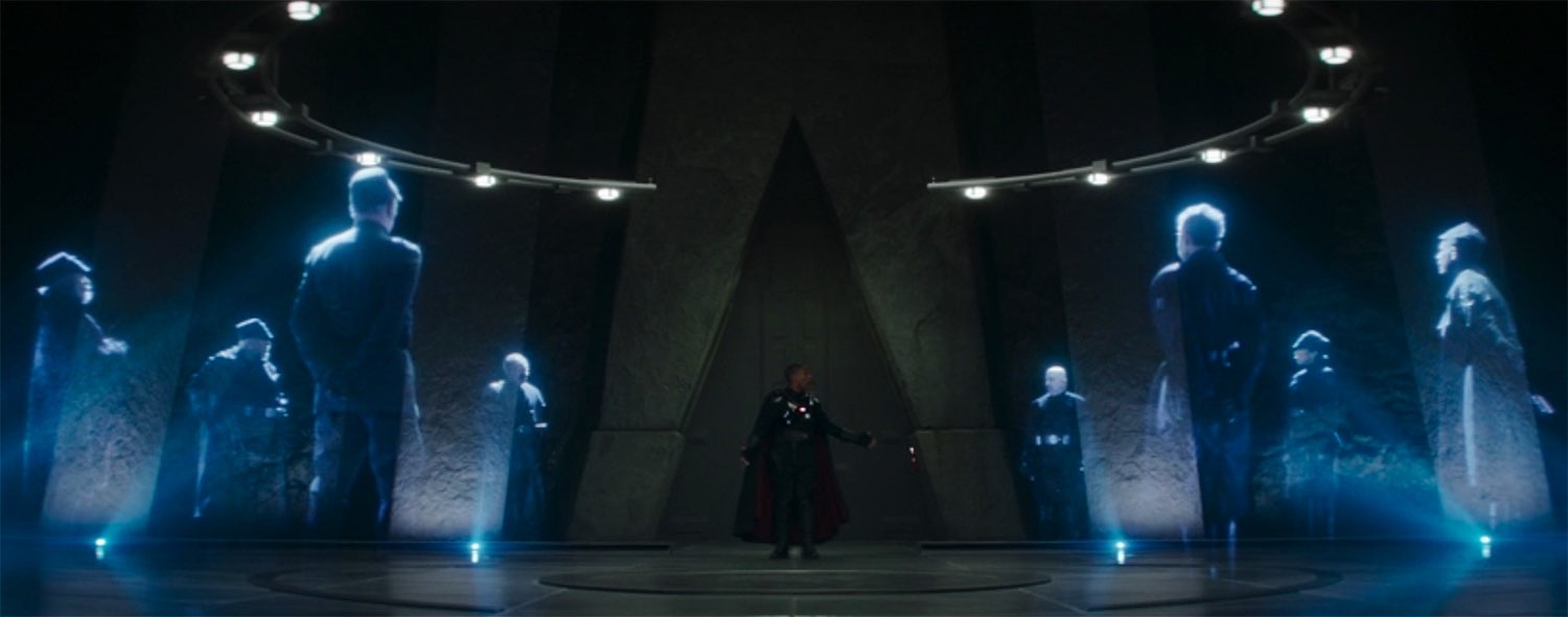 The episode opens with Katy O’Brian’s Elia Kane, a double-agent who works for Moff Gideon, making her way through Coruscant’s underbelly. The atmosphere is captured masterfully with smart shots that stay on Katy O’Brian’s Elia Kane and make good use of the artificial lighting to create a fitting tribute to Blade Runner. Moff Gideon finally shows up and holds a Bad Guy Zoom call with the Shadow Council.