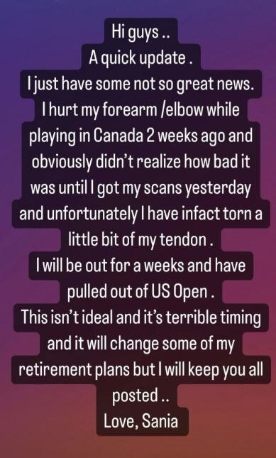 "Hi guys, a quick update. I just have some not-so-great news. I hurt my forearm/elbow while playing in Canada 2 weeks ago and obviously, didn't realise how bad it was until I got my scans yesterday and unfortunately, I have in fact torn a little bit of my tendon," Mirza wrote on Instagram.