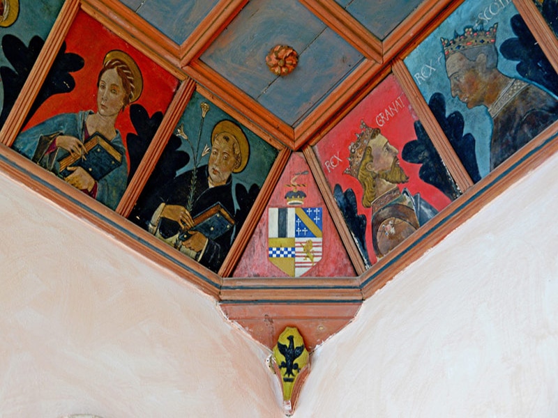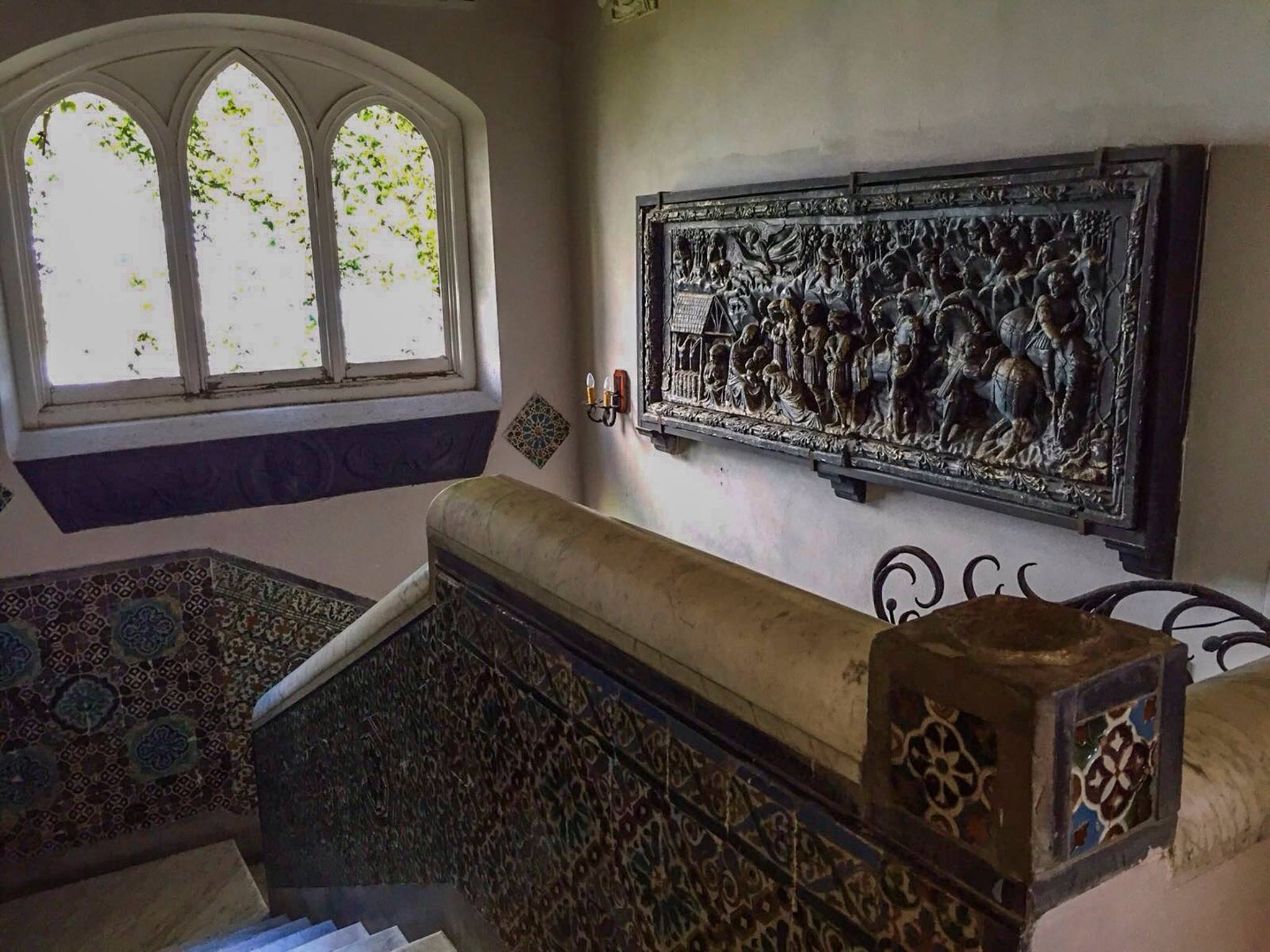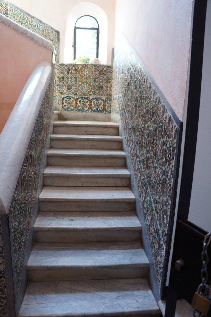 THE STAIRS: The staircase features stunning laggioni ceramic tiles while the stairwell boasts a medieval-style wooden ceiling covered with paintings of saints and rulers.