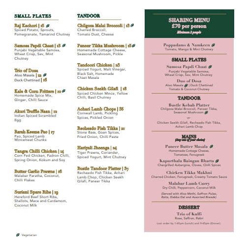 What would a three-course meal at Bombay Bustle cost? First, see the menu:
