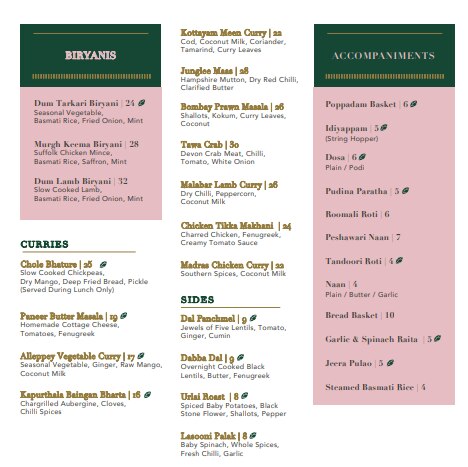 For example, the restaurant offers Chicken Seekh Gilafi, Achari Lamb Chops, Butter Garlic Prawns, Paneer Butter Masala, Kapurthala Baingan Bharta, Chicken Tikka Makhani and Malabar Lamb Curry.