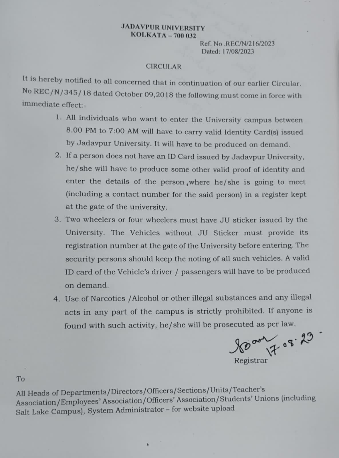 The university has instituted a time-based entry restriction for outsiders. According to the notice, no external individuals will be permitted to enter the campus before 7 am or after 8 pm.
