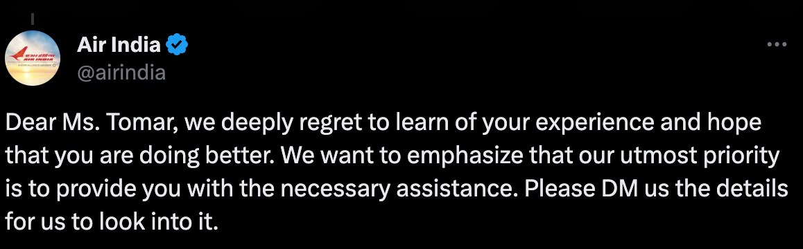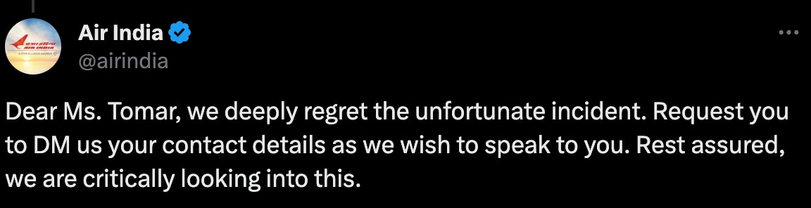 Air India replied to Charu Tomar's tweets on X and apologised for the incident.