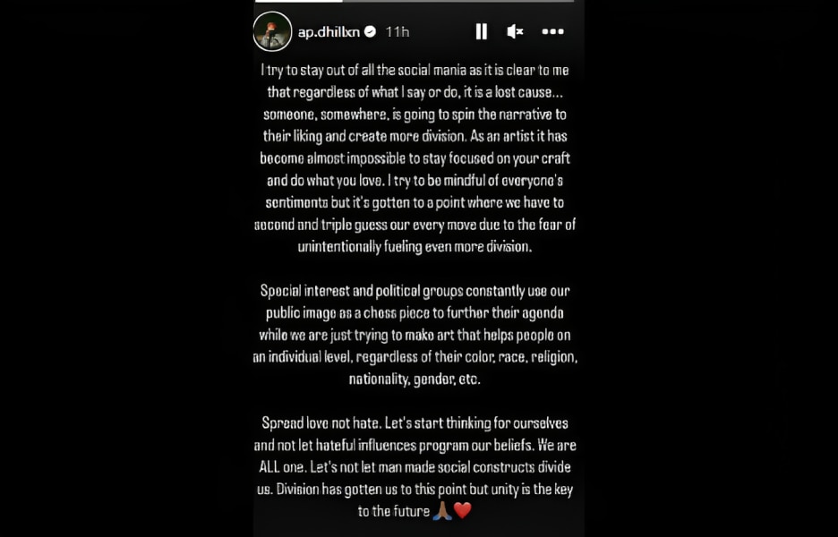 In his Instagram post, AP Dhillon accused political groups of exploiting the celebrity status of artists to further their personal agendas, while the artists themselves are merely striving to earn a livelihood through their art.