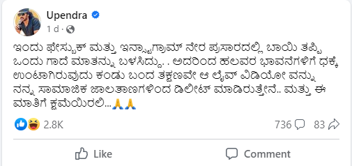 However, soon after, Upendra also tweeted on X saying that the whole situation was being blown out of proportion by people who don't know his life story, being born into poverty and struggling to rise above by himself.