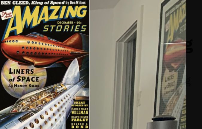 Elon Musk is renowned for his affinity for science fiction, and the photo bears witness to this fact. Adorning the wall in the image is the cover art from the popular science magazine "Amazing Stories," showcasing a special cover art for Henry Gade's sci-fi tale, "Liners of Space."