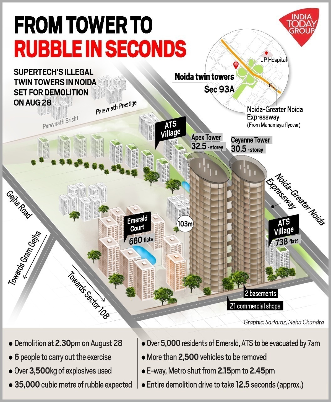 The Supertech Twin towers at Noida Sector 93A, Uttar Pradesh, are all set to be demolished on August 28. Residents of the neighbouring societies have been asked to vacate the area by 7 am this Sunday. The Noida-Greater Noida Expressway, meanwhile, will be closed to all traffic for 30 minutes.
