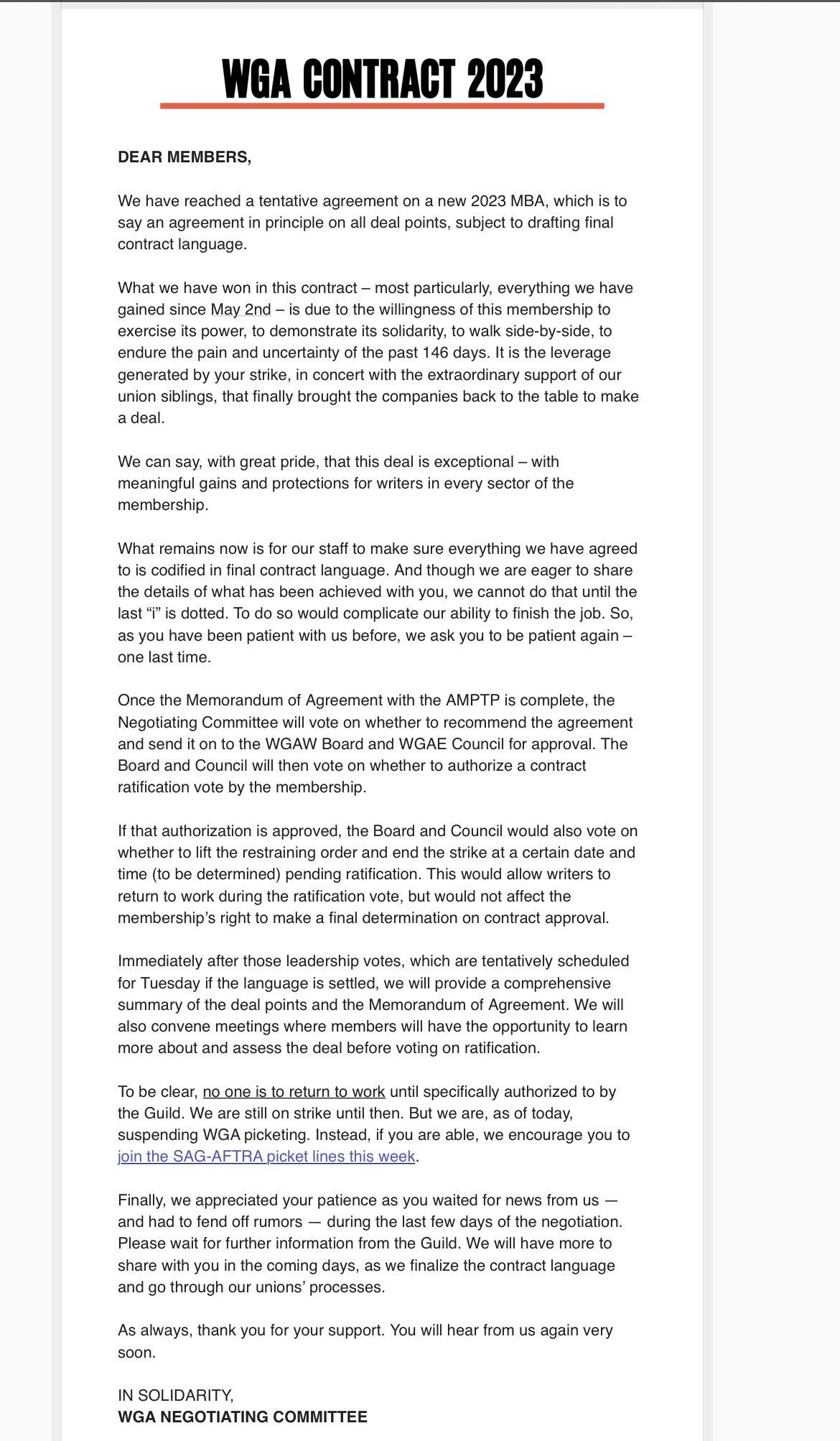 The SAG-AFTRA Negotiating Committee congratulates the WGA Negotiating Committee.