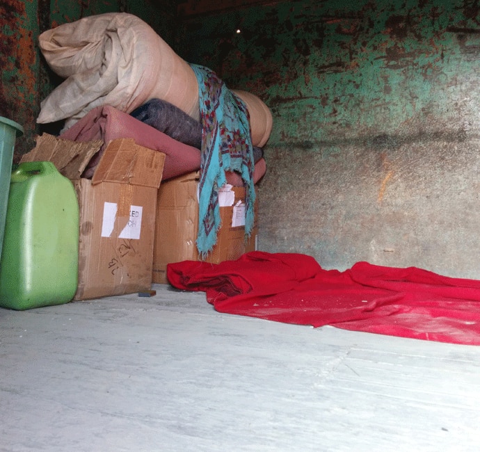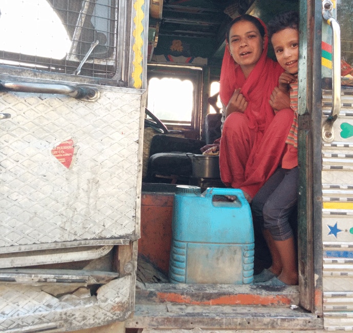 Razia’s family of five got preferential allotment because her husband happens to drive the truck for a living. Three other families have been squeezed into the open rear carriage of the truck. A thin plastic sheet tied to wooden props provides an illusion of a safety of a roof. (Something like this: the truck-house on the left).