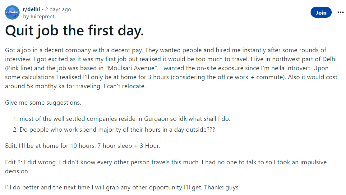 This fresher, on the first day of his first job in the professional world, decided to ditch it because he realised his daily commute from his corner of the world, i.e., Southwest Delhi along the Pink Line of the Delhi Metro to his office near Moulsari Avenue In Gurugram was a globe-trotting adventure.