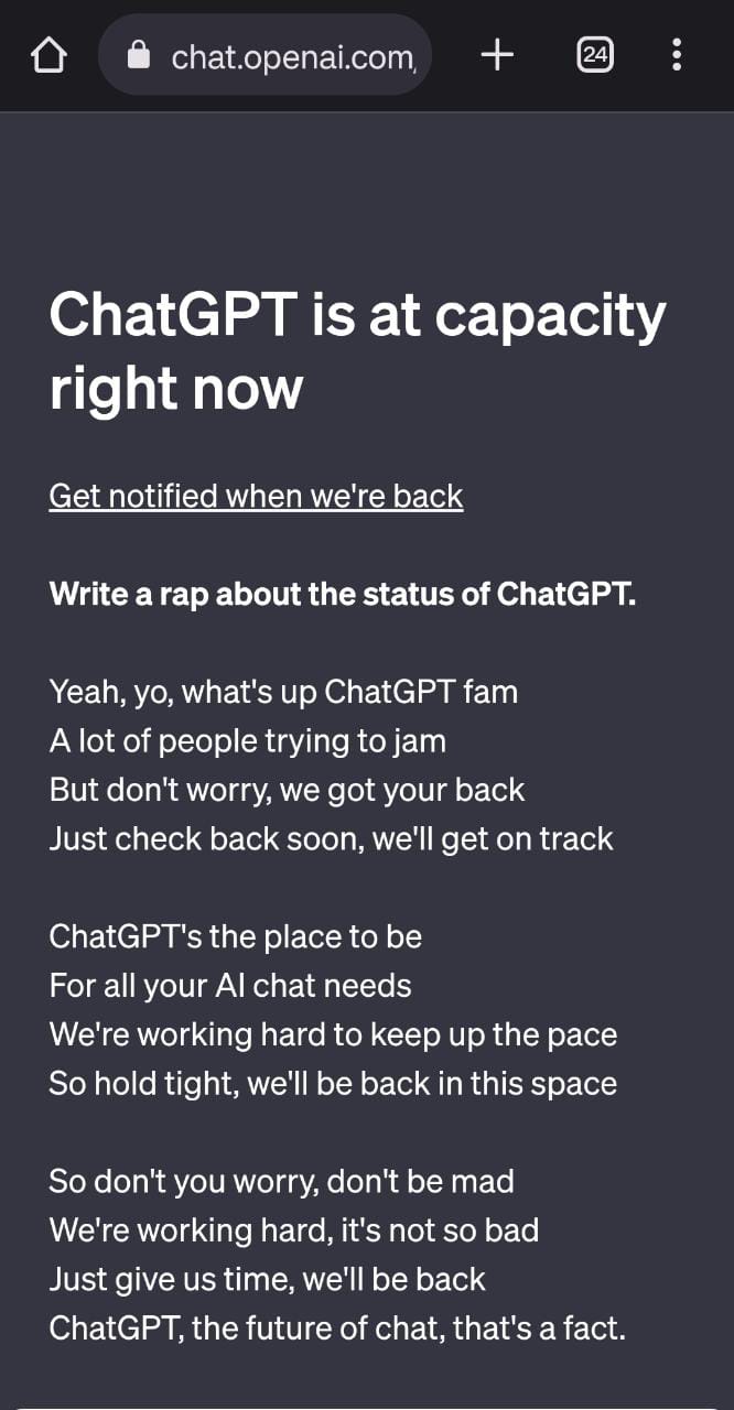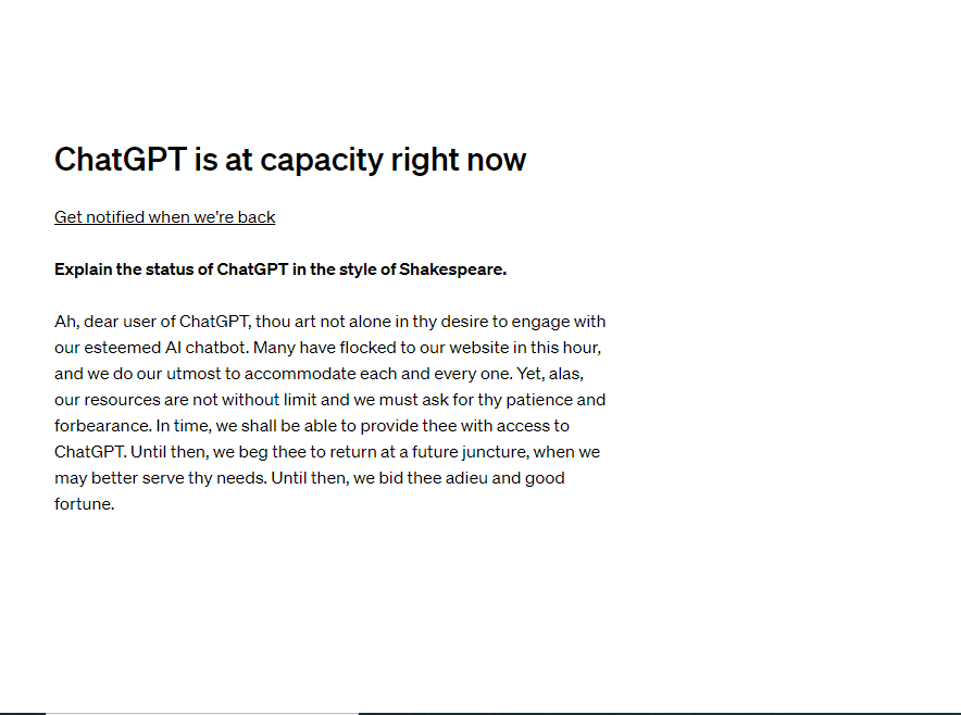 In a rather unique approach, ChatGPT attempts to appease visitors during the site's downtime by reciting a rap and offering apologies in the style of Shakespeare.