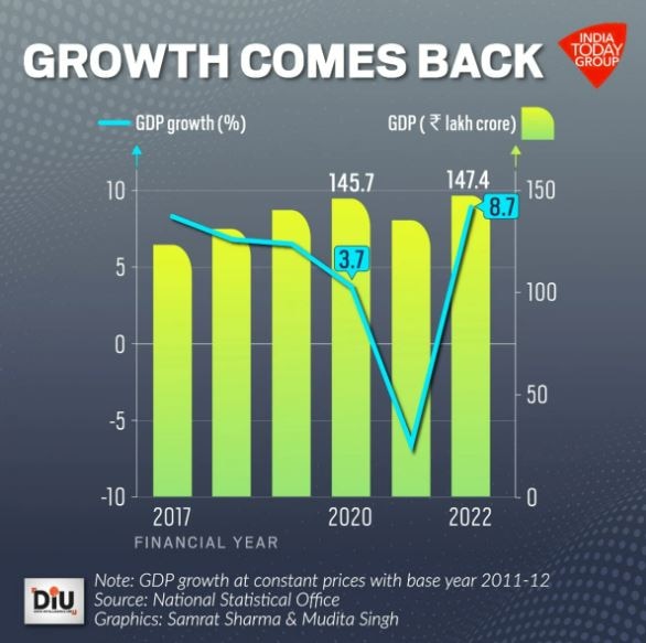 The GDP growth was estimated at 8.7 per cent in the financial year 2021-22 against a contraction of 6.6 per cent in the previous year.