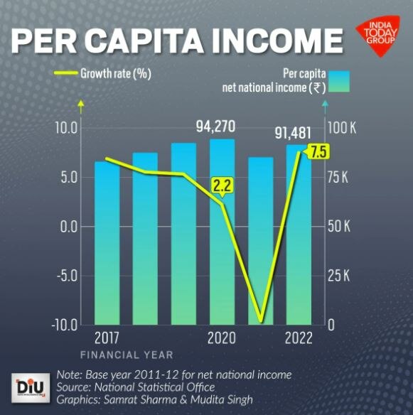 - According to the data released by the National Statistical Office (NSO), India’s real GDP grew to Rs 147.36 lakh crore from Rs 135.58 lakh crore in 2020-21. Gross Value Added (GVA) growth during the fiscal ending March 2022 was at 8.1 per cent as against a contraction of 4.8 per cent in the preceding year.